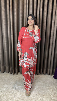 Rust Printed Co-ord Set with Tropical Motif - L / Soft breathable cotton Muslin
