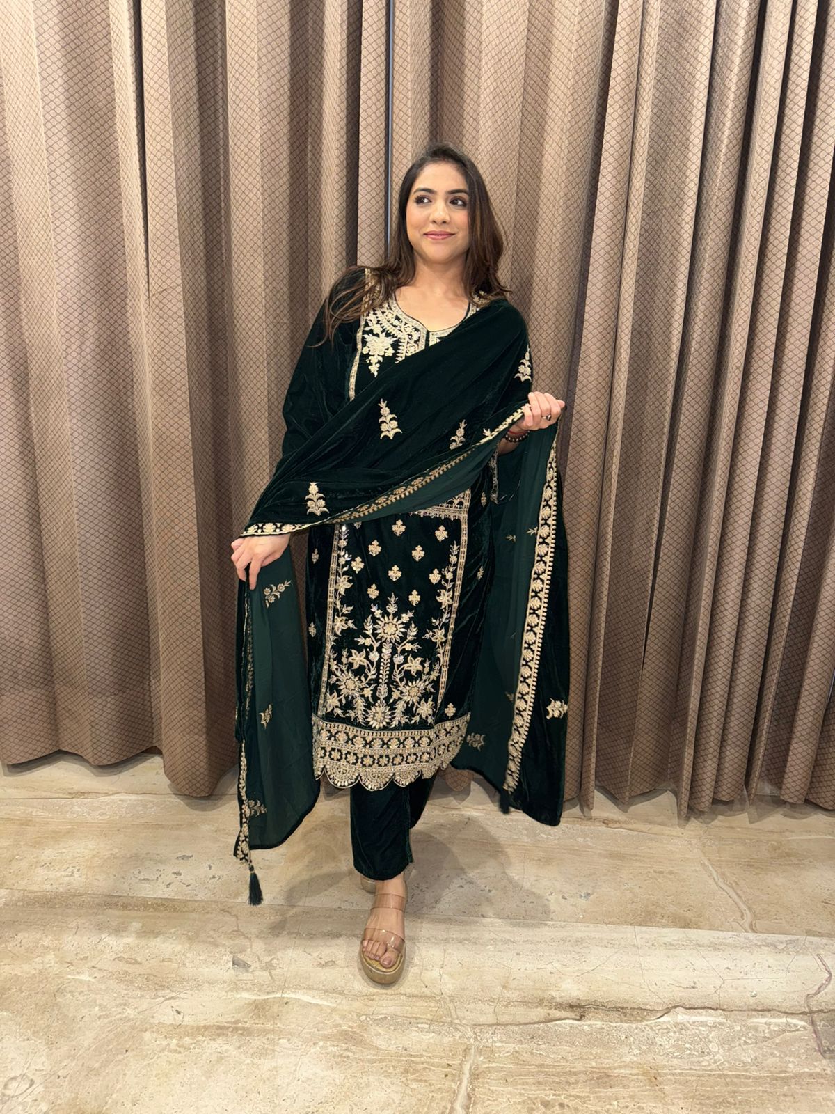 Emerald Heavy Zari & Mirror work Kurta Set with Dupatta - M / Velvet