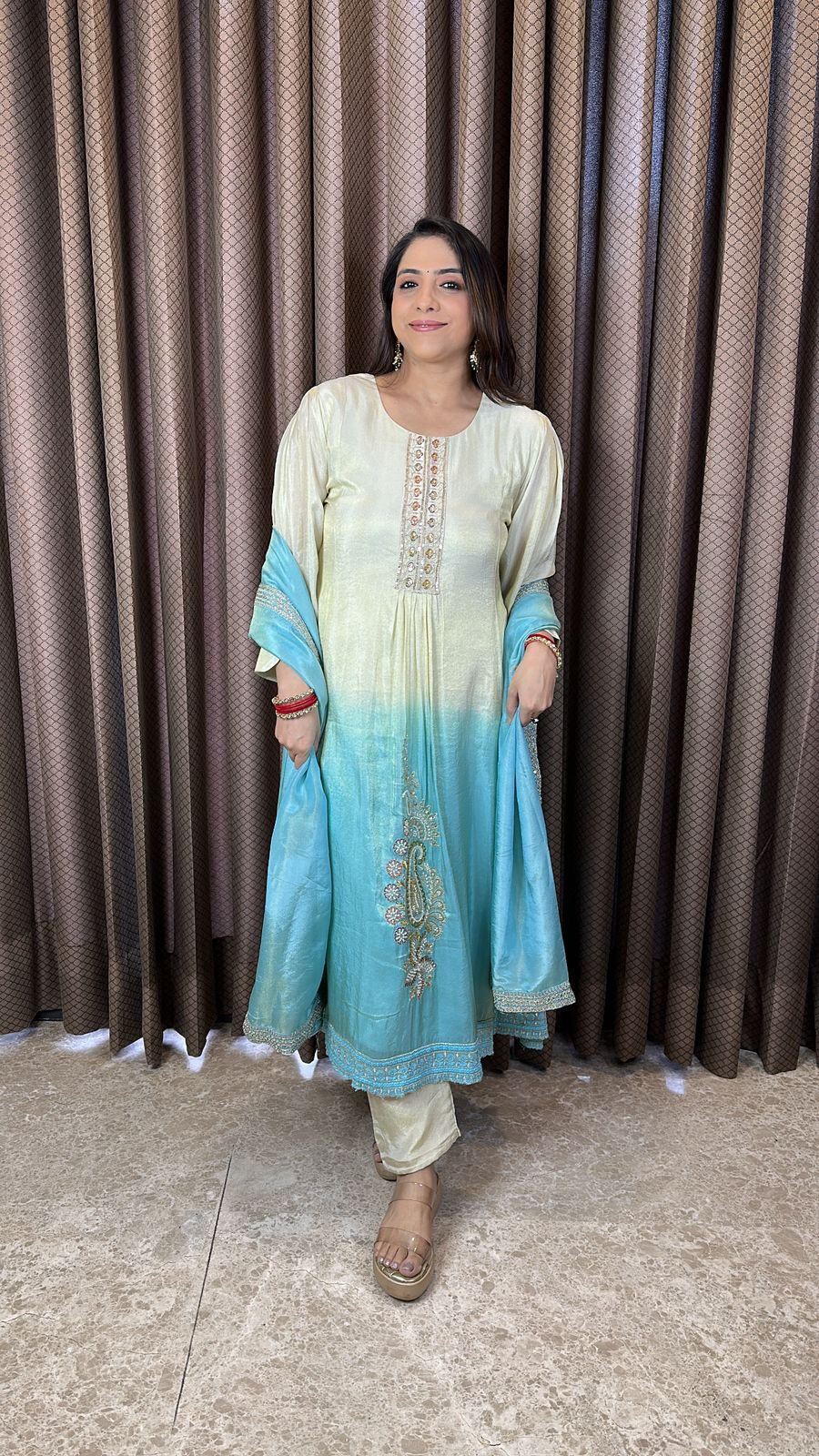 Aqua Blue & Ivory Ombre Kurta Set with Embellished Detailing