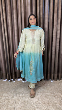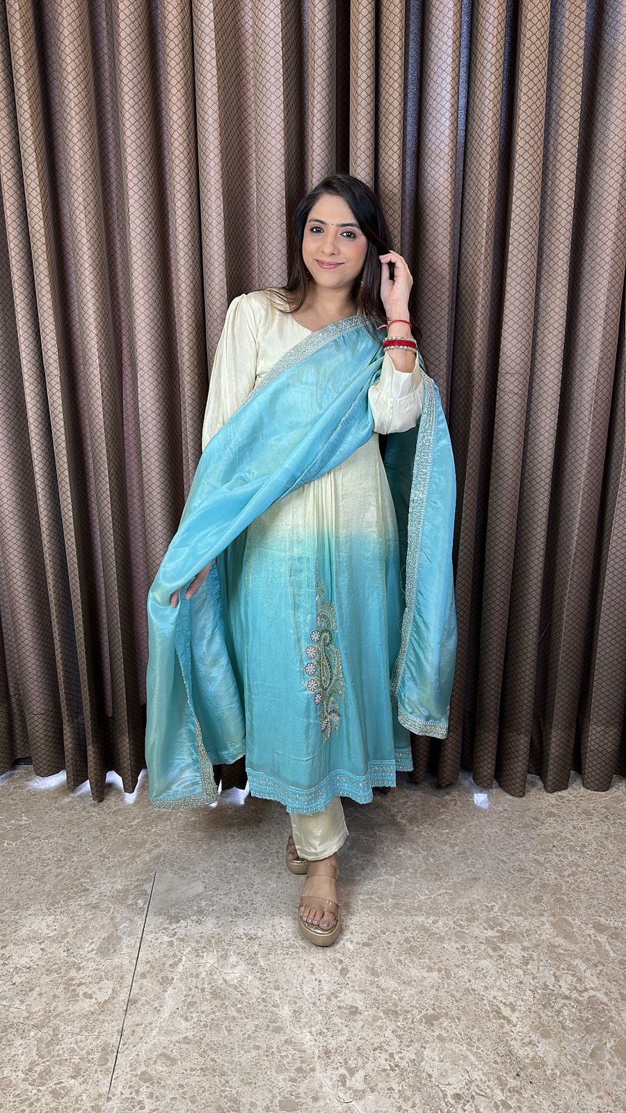 Aqua Blue & Ivory Ombre Kurta Set with Embellished Detailing - M / Shimmer with Lining