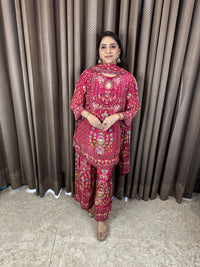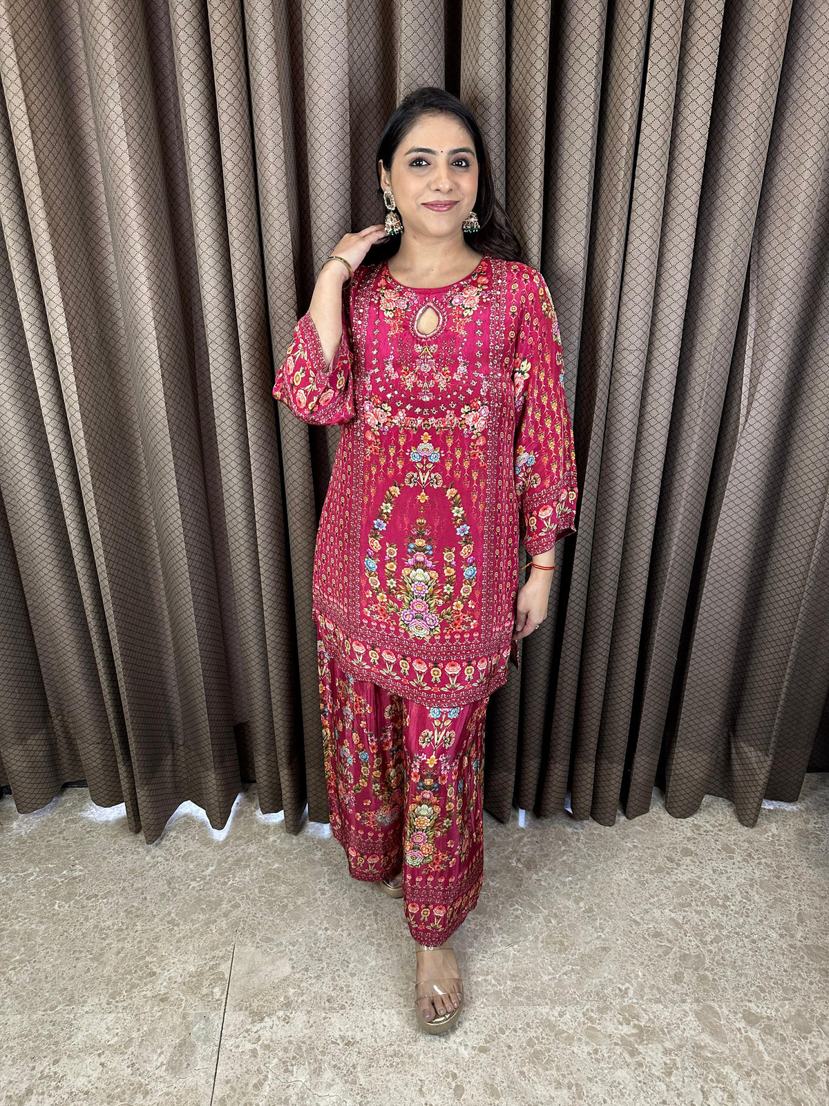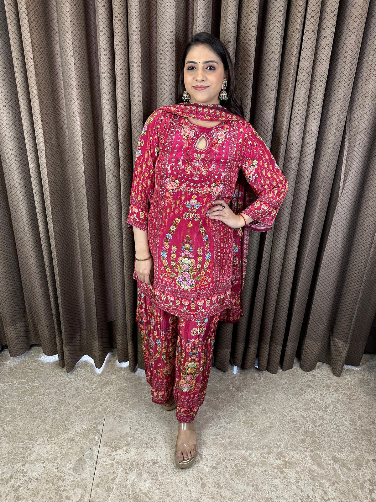 Deep Magenta Floral Printed Suit Set with Keyhole Neckline