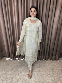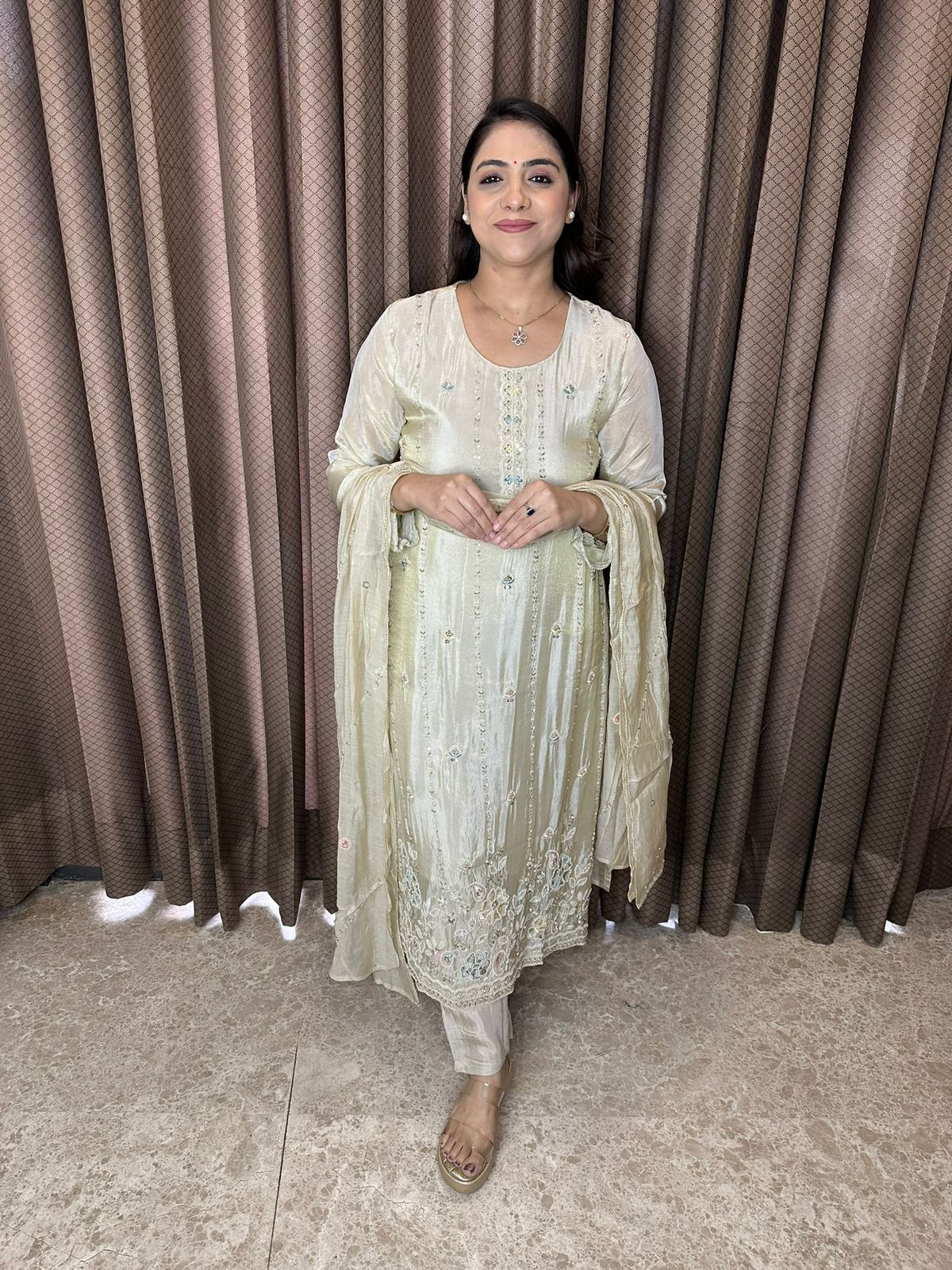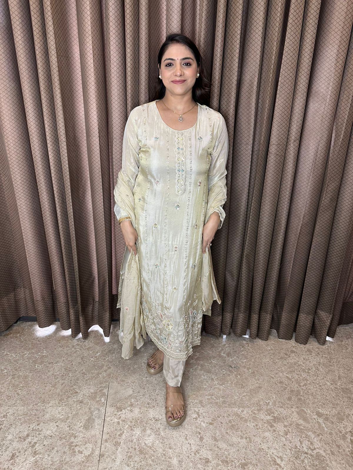 Elegant Beige Embroidered Suit Set with Dupatta - M / Shimmer Tissue with Lining