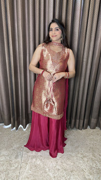 Maroon Brocade Palazzo Set with Designer Dupatta and Potli - M / Brocade with Chinon Palazzo