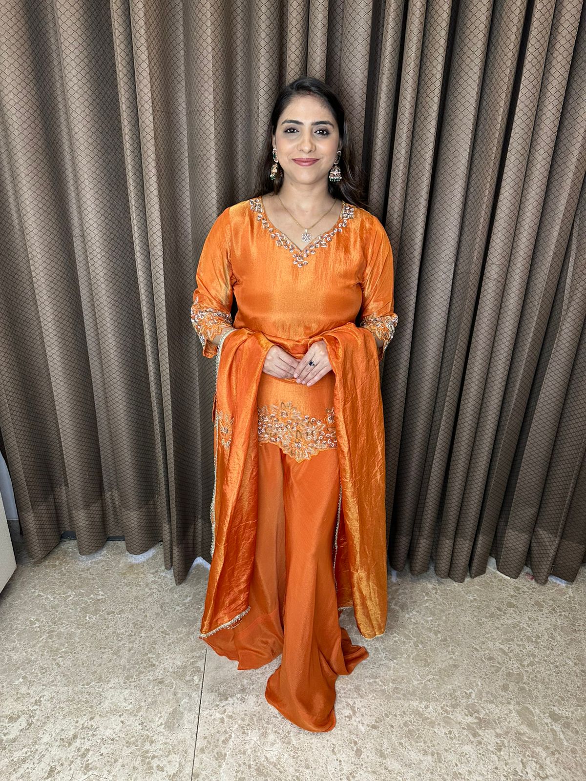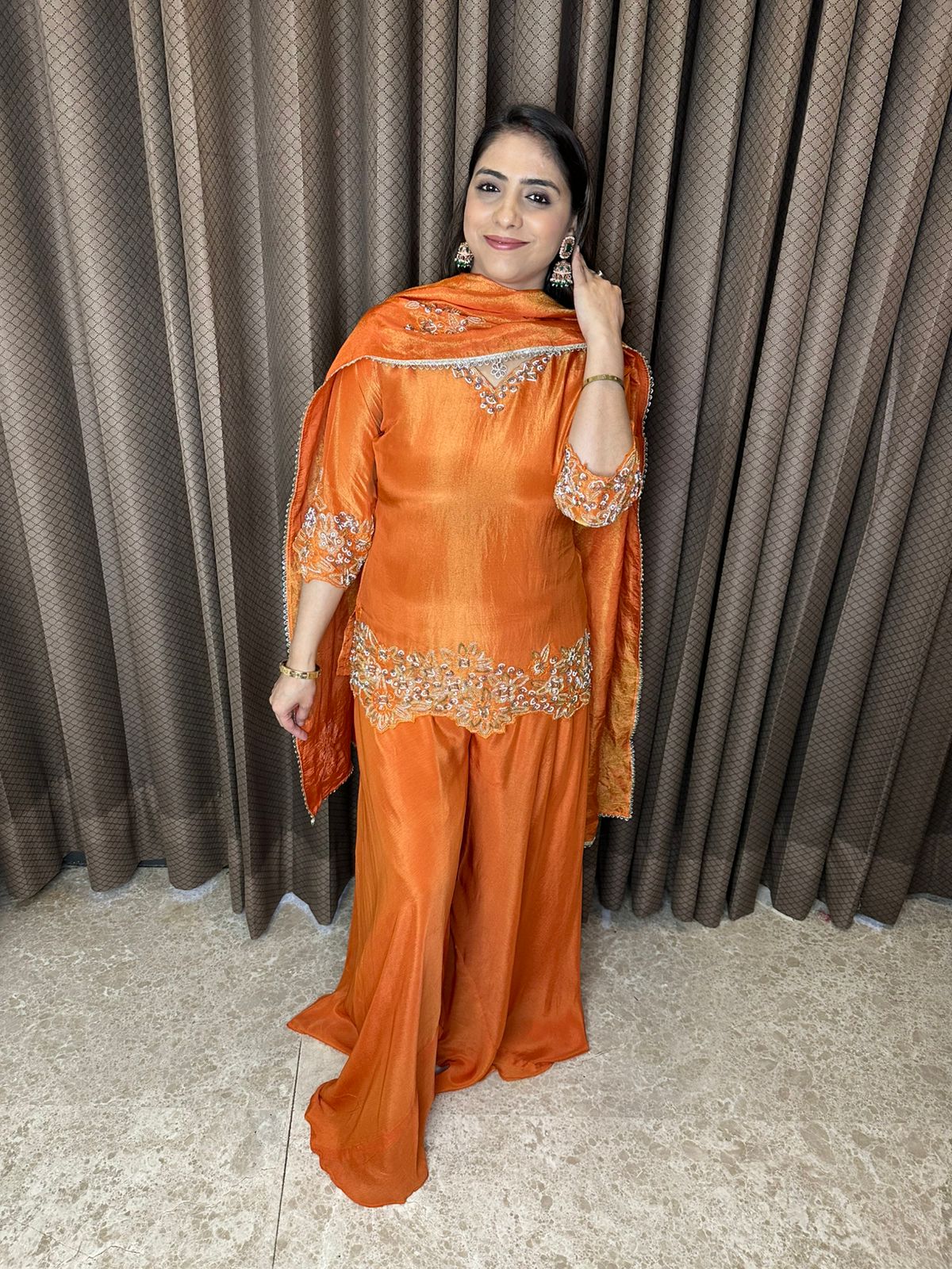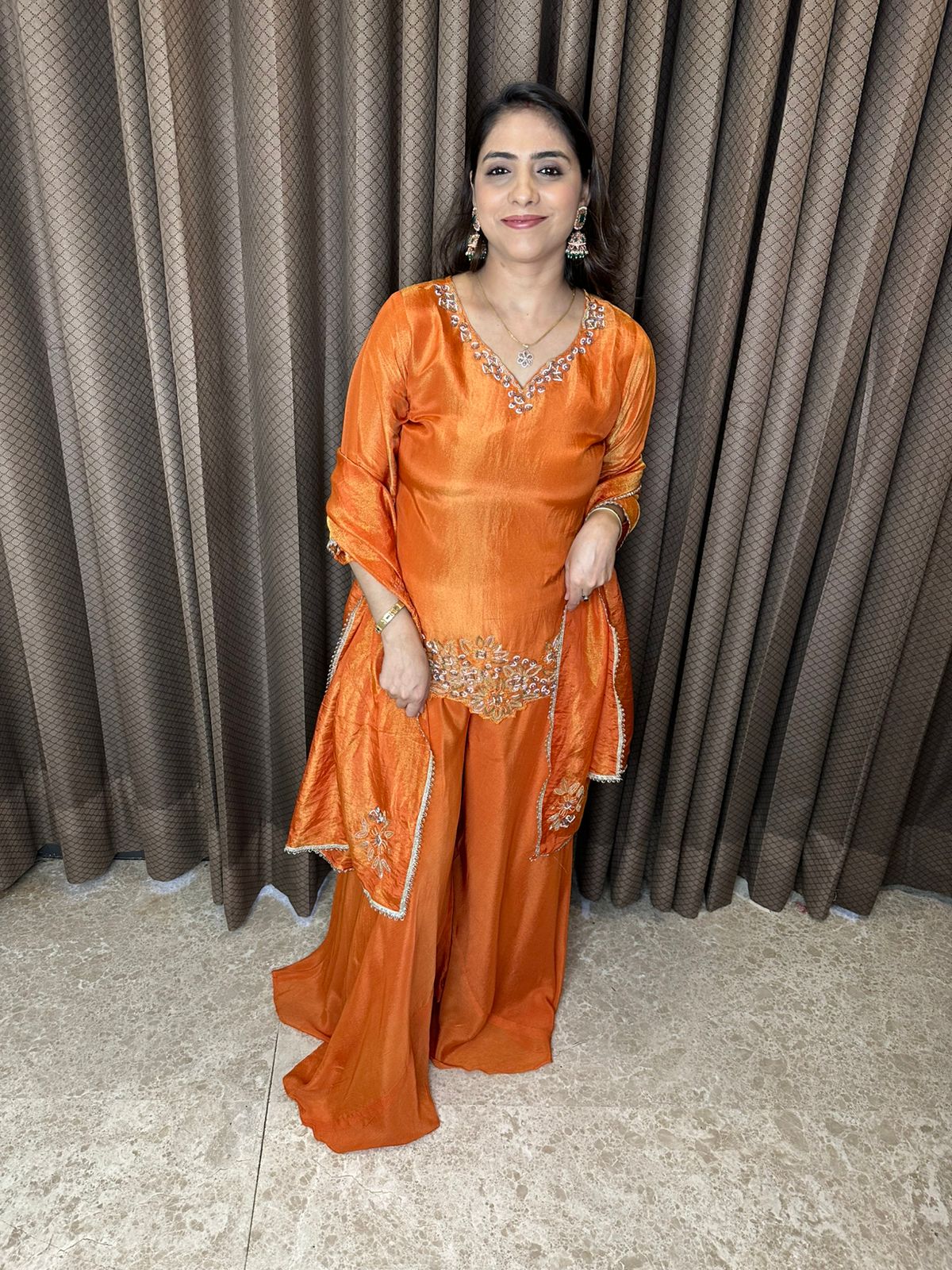 Rust Orange Embroidered Kurta with Palazzo & Dupatta Set - M / Shimmer Tissue with Lining