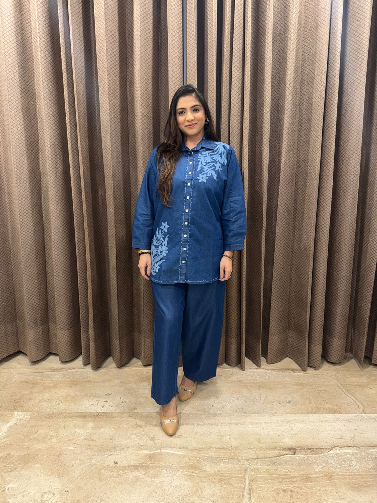 Blue Denim Floral Embroidery Two-Piece Co-ord Set