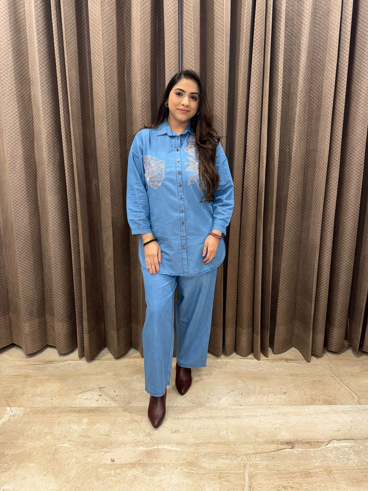 Modern Denim Co-ord Set with Statement Floral Detailing - Soft Denim / M