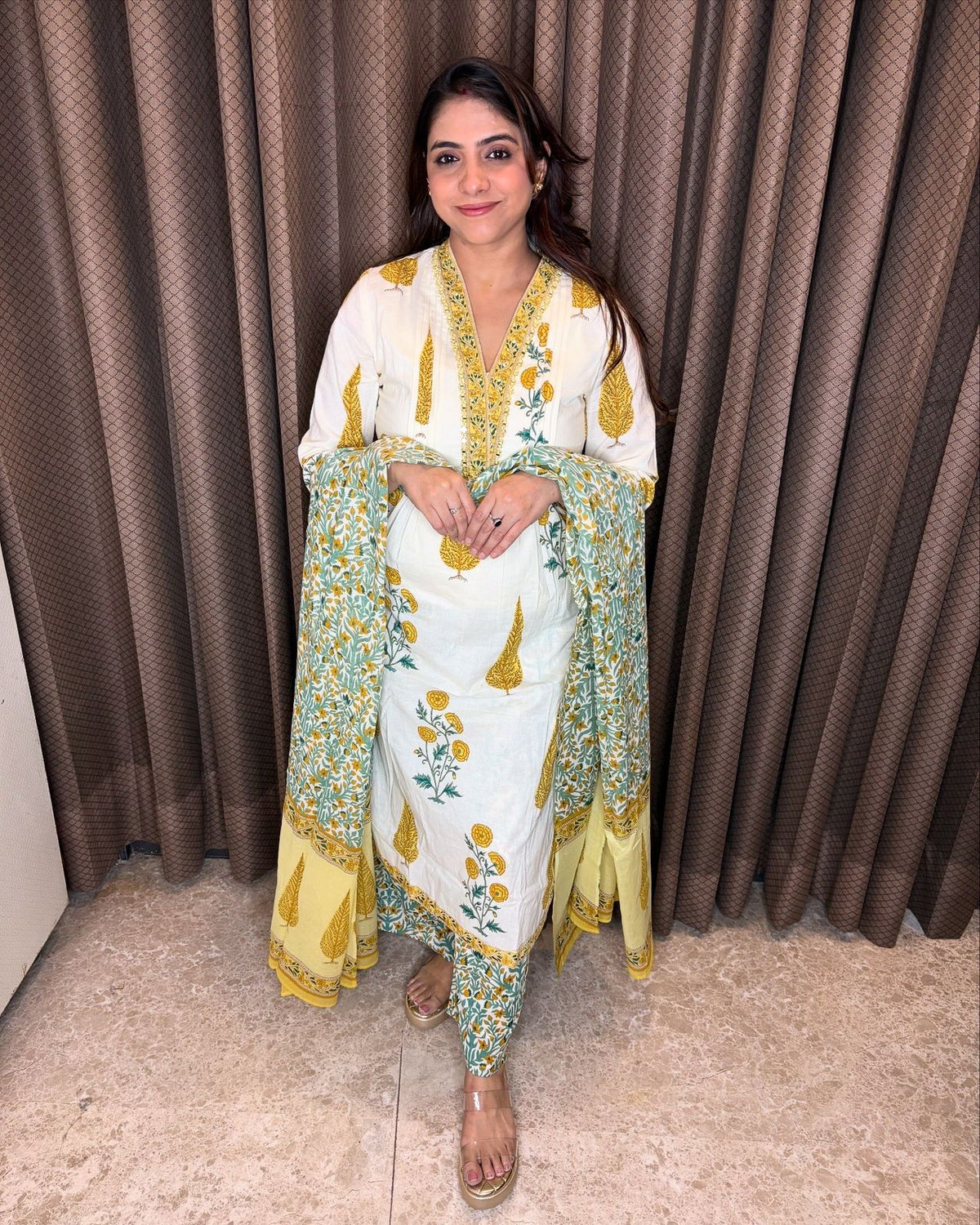 Elegant Off-White Kurta Set with Yellow Floral Print and Matching Dupatta