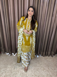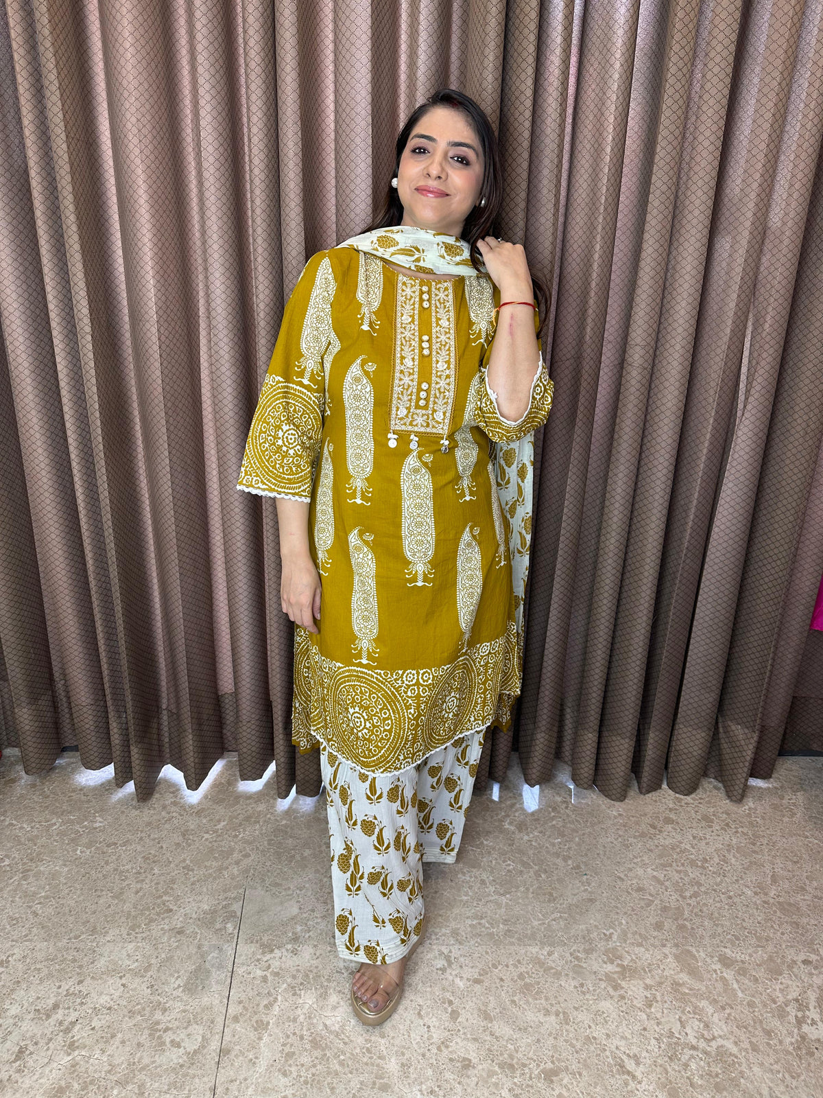 Mustard Printed Farshi Set with Dupatta - XL / Cotton